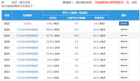 杭州市的初级会计人员武学需要登录浙江省会计人员管理系统平台,登录网址是https://jxjy.czt.zj.gov.cn/front/jxjy.html,登录进去就能查看,各年需要补学的学习年度,如下图: